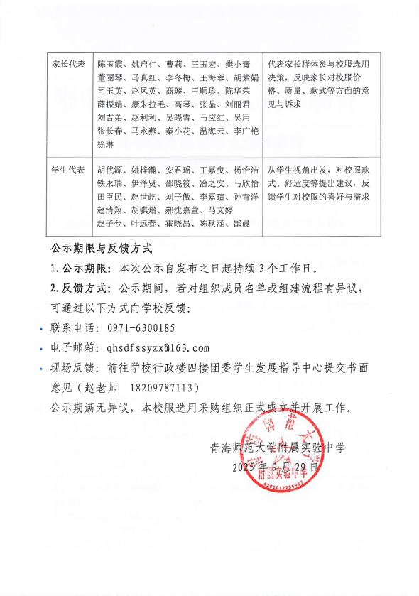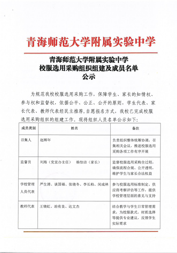青海师范大学附属实验中学校服选用采购组织组建及成员名单公示
