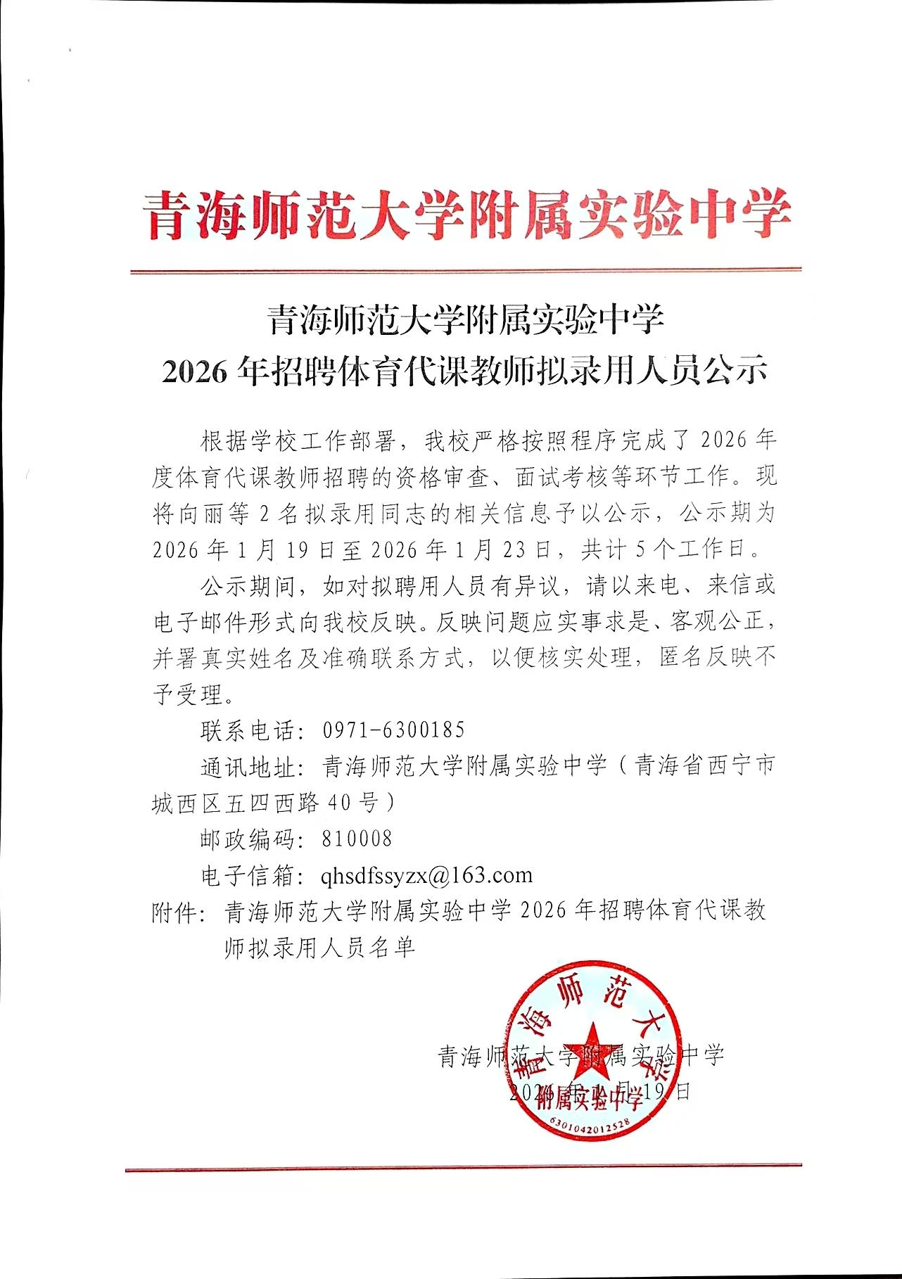 青海师范大学附属实验中学2026年招聘体育代课教师拟录用人员公示